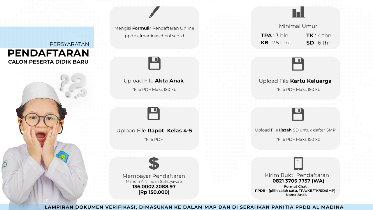 TPA, KB, TK, SD dan SMP Islam Al Madina menyediakan PPDB secara online diharapkan proses PPDB dapat berjalan cepat dan bisa dilakukan dimanapun dan kapanpun selama sesi PPDB Online dibuka. Proses pendaftaran calon siswa baru di masa new normal ini jika wali murid terhambat oleh jarak untuk datang ke sekolah langsung, bisa mengakses website PPDB Online TPA, KB, TK, SD dan SMP Islam Al Madina.